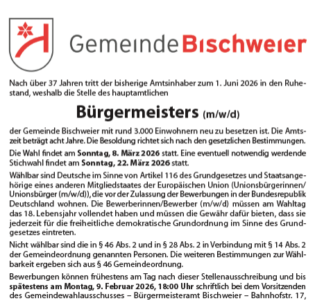 Das Landratsamt Rastatt - Amt für Flurneuordnung, Geoinformation und Vermessung (untere Vermessungsbehörde) wird ab der 48. Kalenderwoche 2025 in den Gemarkungen Bischweier, Oberweier und Rotenfels, zwischen den Gewannen Hasensprung, Forlen und Forlen (Heckenäcker), Vermessungs- und Grabarbeiten durchführen. Bei den Arbeiten handelt es sich um Grenzfeststellungen gemäß § 5 Abs. 3 Vermessungsgesetz für Baden-Württemberg (VermG). Sie stehen im Zusammenhang mit der Flurbereinigung "Bischweier".