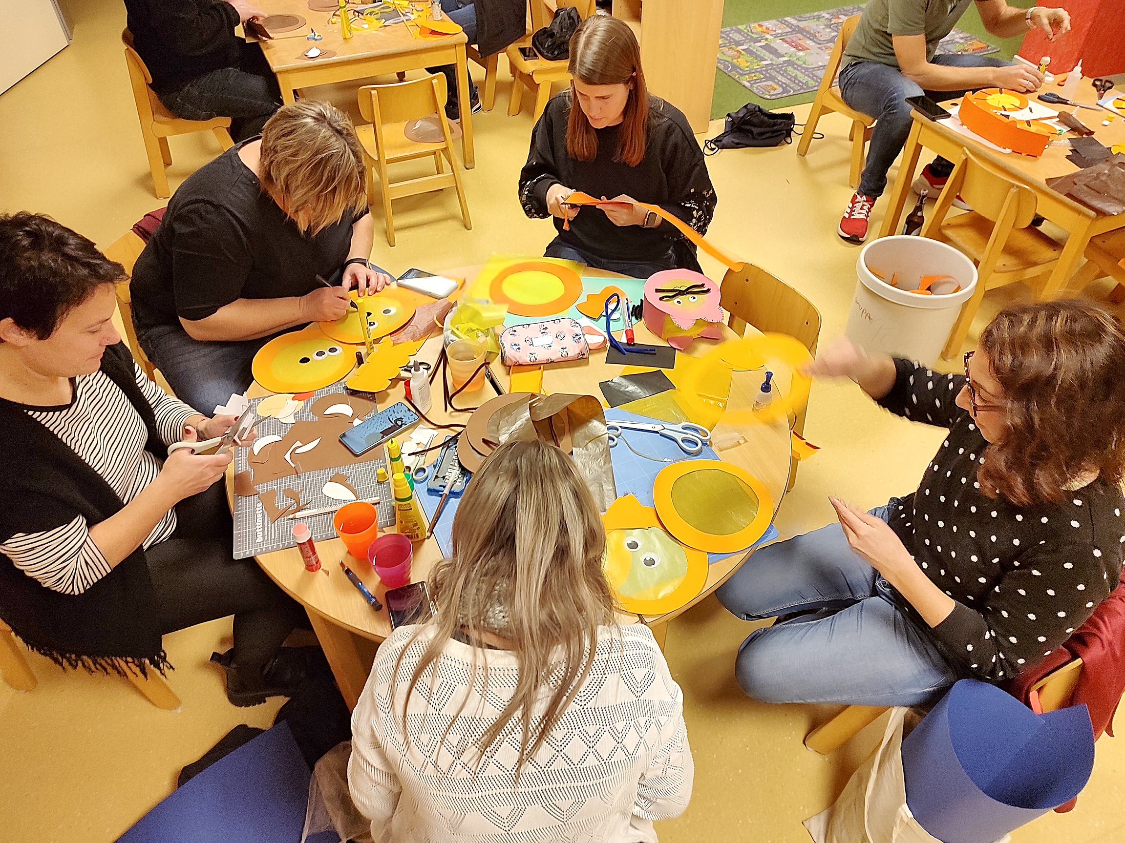 In diesem Jahr hatten die Eltern selbst die Gelegenheit, zum Gelingen des Festes beizutragen: Bei einem gemütlichen Bastelabend entstanden in fröhlicher Runde die wunderschönen Laternen, die später die Räume erhellten. Die Stimmung war ausgelassen, es wurde gelacht, geschnitten und geklebt - und am Ende war die Vorfreude groß. Am nächsten Morgen konnten die Eltern ihren Kindern stolz die fertige Laterne zeigen - und die Kleinen warteten schon ganz aufgeregt darauf, endlich ihr eigenes Licht in den Händen zu halten.
